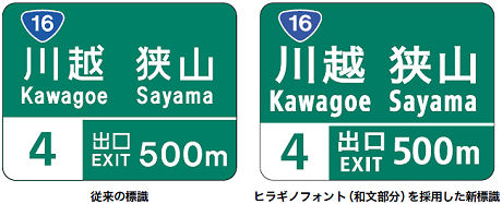 大日本スクリーン製造のヒラギノフォントが、東日本高速道路、中日本高速道路、西日本高速道路各社による道路標識の技術基準の見直しにおいて、高速道路の案内標識に使用される和文書体として新たに採用され、この書体による標識の設置が全国で進んでいる。![]() これまで使われていたのは、昭和30年代に考案された「公団ゴシック」。字の印象を決める部位を強調するなどの工夫が凝らされていたが、省略が多すぎるとの指摘があるほか、新しい文字が必要になるたびに一からデザインするため、統一性に欠ける問題もあった。 - ヒラギノフォント、高速道路標識の和文書体に採用〜案内標識の視認性のさらなる向上に貢献〜(PDF:215KB) - asahi.com(朝日新聞社):高速道路の標識、「ヒラギノ」書体に iPadと同じ - 社会 [10-12-14]