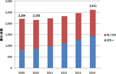 調査会社のインフォトレンズが、国内プロダクション専用デジタル印刷機市場の規模と予測を発表した。それによると、2009年の実績は、販売台数で2,209台、販売金額で279億2,800万円であった。2010年は販売台数・金額とも減少傾向となるものの、2011年以降は景気回復やカラー機の新製品の増加、インクジェット機の改良などにより増加へ転じるとしている。 2009年〜2014年における CAGR(年平均成長率)は、販売台数で3.4%(2014年の販売台数は2,611台)、販売金額は2.1%(2014年には309億6,500万円)を見込む。 ![]() ニュースリリース: - 国内プロダクション専用デジタル印刷機市場規模と予測を発表 (PDF) [10-12-24]