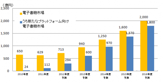 - ――電子書籍ビジネス調査報告書2012発行―― 2011年度の新プラットフォーム向け電子書籍市場規模は112億円 前年度比363%増 ?電子書籍市場全体は629億円、2016年度に2,000億円規模へ成長と予測? | インプレス R&Dインプレス R&D が、日本国内の2011年度の電子書籍市場規模を発表しました。 それによると、2011年度の電子書籍市場規模は629億円と推計され、2010年度の650億円と比較し、-3.2%と微減となります。新たなプラットフォーム向け電子書籍市場は対前年比363%増の112億円へと急速に拡大しているものの、フィーチャーフォンからスマートフォンへのデジタルコンテンツのシフトがスムースに進んでいないことから、ケータイ向け電子書籍市場の落ち込みを補完できていないとのことです。 2012年度以降の日本の電子書籍市場については、ケータイ向け電子書籍市場の減少傾向は続くものの、新たなプラットフォーム向け電子書籍市場の急速な立ち上がりにより、2016年度には2011年度の約3.6倍の2,000億円程度になると予測しています。