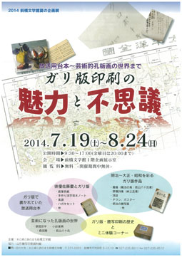 ![]() 2014年7月19日(土)より8月24日(日)まで、水と緑と詩のまち前橋文学館にて、 -放送用台本~芸術的後半の世界まで- 「ガリ版印刷の魅力と不思議」と題した企画展を開催しております。 [14-07-28]