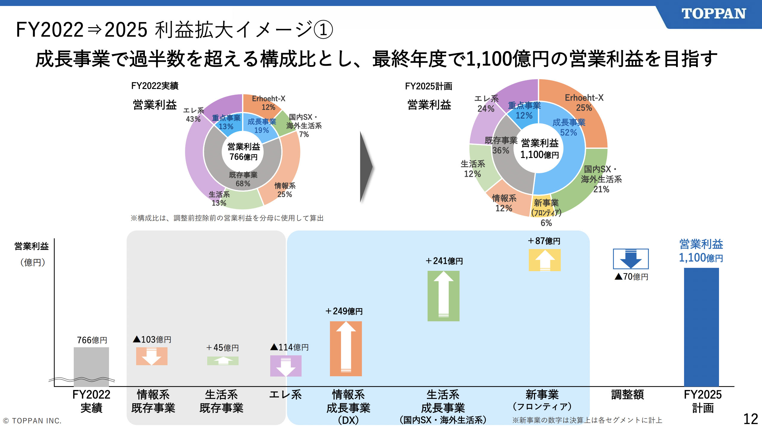 国内パッケージでは、「紙器事業の再構築実施による、全国製造拠点の再編に伴う固定費削減」や「低収益品の見直しによる改善」を通じた収益改善案が発表されました。その結果、国内パッケージなど生活系既存事業では(情報系既存事業とは対照的に)、2025年度の営業利益率は(2022年度と比較して)45億円増加する計画となっています。