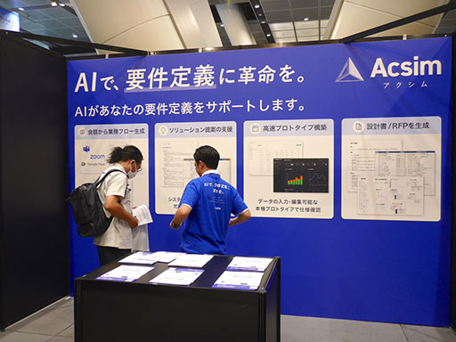 中には、印刷営業DXの参考になりそうなAIサービスもありました。ROUTE06社ブースで紹介されていた「Acsim(アクシム)」は、顧客とのヒアリング内容から「現状業務フロー生成・課題特定を自動化」し、さらに「改善方針・改善計画策定をAIエージェントが支援」することもできる、AIを活用した要件定義支援プラットフォームです。