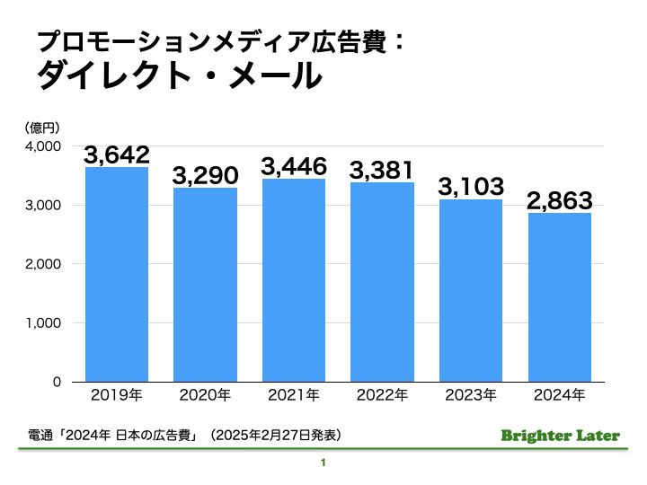 電通「2024年 日本の広告費」(2025年2月27日発表)によれば、2024年のDM(ダイレクト・メール)広告費は2,863億円(前年比 7.7%減)でした。2023年も前年比 8.2%と大きく減少していて、コロナ禍前(2019年、3,642億円)と比べると、その市場規模は8割程度まで縮小しています。