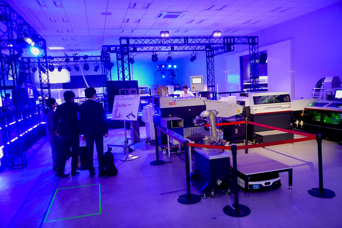 ところで、「無人化ゾーン」では消灯工場をイメージした「Lights Out」という演出がされていました。これは単に照明を暗くするのではなく、青から紫に変わる照明の中スポットライトがゆっくり動くといったもので、ゾーン内ツアーでもデモの様子が分かる明るさ(暗さ?)になっていました。また、ツアーで歩くコースの両端は白色だったりして、「未来の工場」を感じさせるとても印象的な演出でした。
