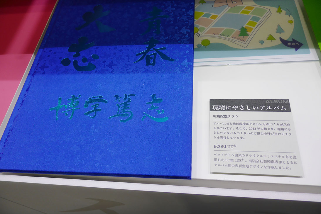 例えば、アルバム印刷会社博進堂(新潟県新潟市)は「環境にやさしいアルバム」を提案。その一例として、ペットボトル由来のリサイクルポリエステル糸「ECOBLUE」を使用した表紙生地のアルバムが展示されていました。また、2022年秋より発行している、環境にやさしいアルバムづくりへのご協力を写真館様・学校様などに呼びかけるチラシもあわせて紹介されていました。